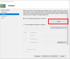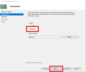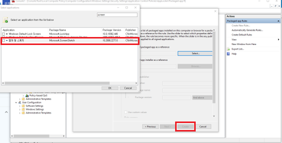 On the screen that opens, right-click and click Create Default Rules, and then follow onscreen instructions on the AppLocker wizard to configure your rules. For example, the following image shows how to create an XML rule to restrict the use of a screen capture tool.