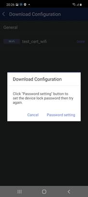 At this point, if the user does not set a lock screen password, the certificate will not be installed, due to the keystore being locked. It means that until a lock screen password is configured on the device, the Android platform will not authorize the use of the keystore and the certificate will not be installed.
