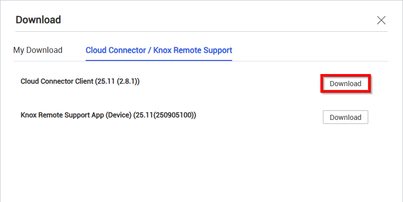 Go to the Cloud Connector / Knox Remote Support tab, then click Download to the right of Cloud Connector Client to download an archive of the SCC client.
