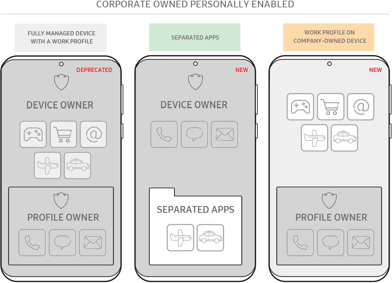 As described in Device management modes, Android 11 replaced the fully managed device with work profile with a new work profile on company-owned devices. The goal is to protect the privacy of personal activities on company devices, and provide IT admins with adequate control over the personal side of the device. For enterprises that still need full control over a device while enabling authorized third-party business apps, Samsung exclusively offers an additional option called Separated Apps.