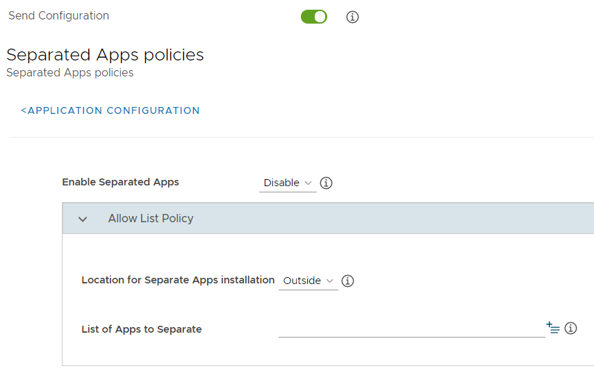 Inside (default): To install the list of apps inside the Separated Apps folder. This works like an allow list, to identify an exclusive list of authorized apps, which get installed in the Separated Apps folder.