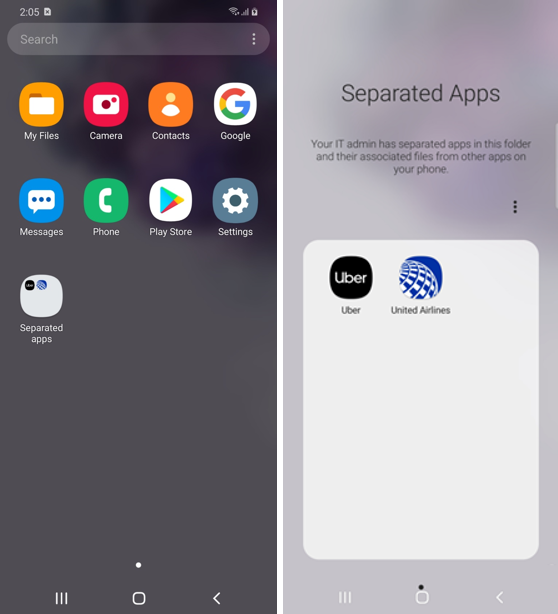 Separated Apps isolates third-party apps in sandboxed folder. The third-party apps cannot intercommunicate with work apps or access confidential work data. Keep in mind that Separated Apps does not provide the same privacy guarantees as the new work profile on company-owned devices. As such, it is not intended for personal apps and data.